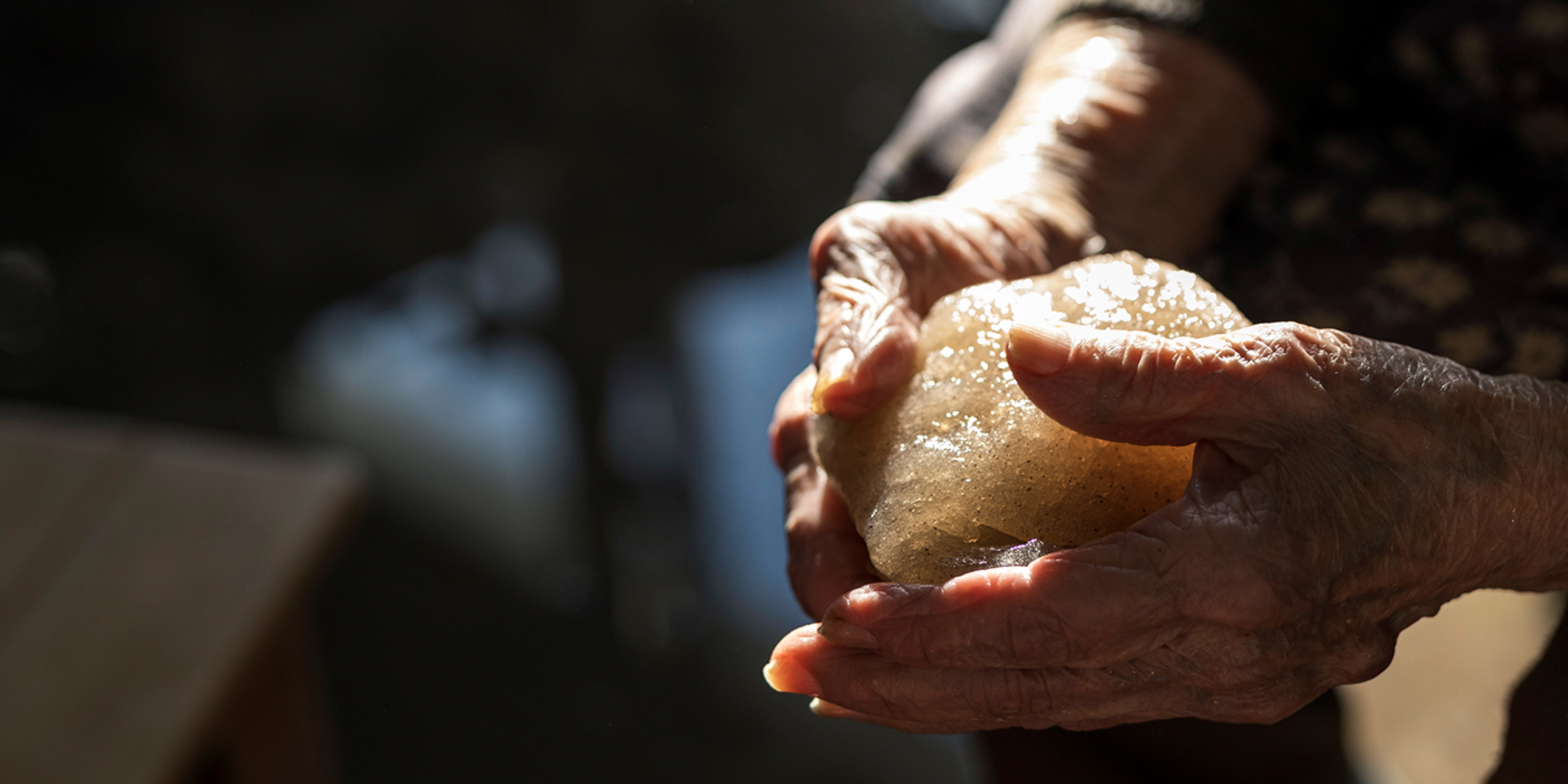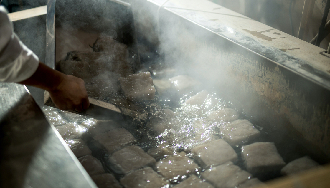 松村蒟蒻商店の蒟蒻は、「バタ練り」(羽がついた箱型の機械でよく練る)という製法で作ります。「バタ練り」をすることで、たくさんの気泡を含み弾力のある歯ごたえや抜群ののどごしを生み出します。また、味のしみ込みがよくなり、少ない時間で調理をすることができます。